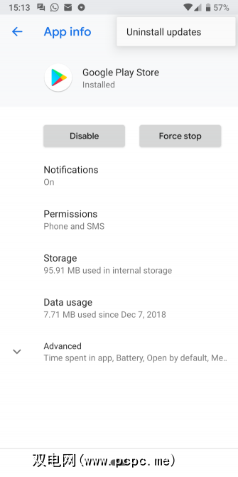 为此,请打开设置>应用和通知>查看所有X应用。从列表中选择 Google Play商店。在其页面上,点击三点式菜单按钮,然后选择卸载更新。这样会将Play商店应用恢复为原始版本。