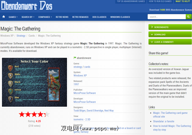 Abandonia为每个游戏提供了详尽的评论,屏幕截图以及编辑和用户评分。您可以按名称,年份,等级和类别浏览和下载旧PC游戏。由于该网站专注于DOS游戏,因此您在这里找不到任何“较新的"废弃软件游戏,但是庞大的DOS档案库应该可以满足您的大多数旧游戏需求。