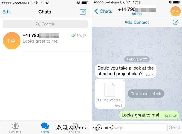 Telegram支持文本,照片,视频,音频和文档。您可以设置一个消息自毁定时器,以从接收设备中删除它,但这是可选的。像Threema一样,Telegram看起来像是带有已读回执的短信客户端。您还可以选择更改消息背景,以在消息传递中注入一些变化。