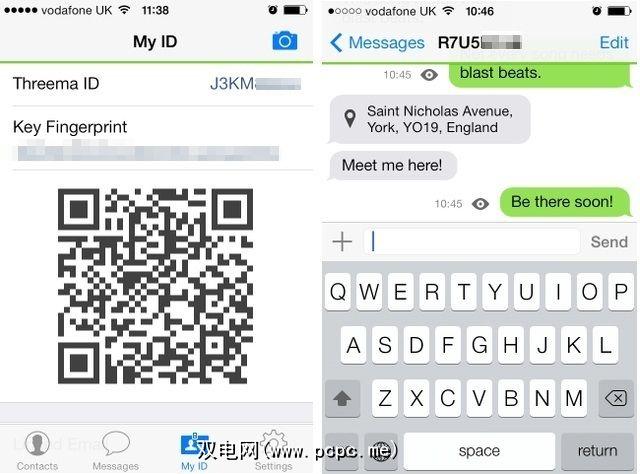 另一个很酷的功能是指示您如何确定向您发送消息的人的身份确实是那个人。如果您通过输入联系人名称来添加联系人,则该联系人的验证级别为红色。如果Threema与您的联系人同步并使用SMS或电子邮件验证从其服务器中提取用户名,则该联系人将获得橙色验证。要达到绿色验证级别,您必须通过扫描他们设备上的QR码与他们交换密钥。