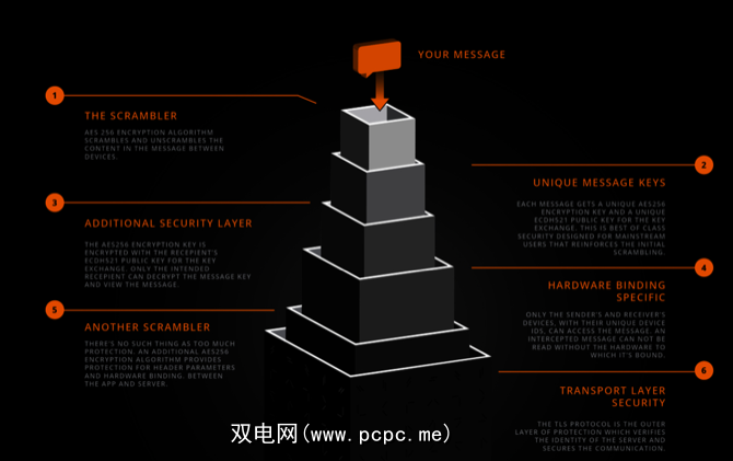 The该应用程序提供4,096位RSA加密,这是一个非常安全的协议。这实际上超出了NSA Suite B合规性准则,这意味着它符合绝密通信准则。它还会从您的消息中删除所有所有元数据,例如日期,时间,位置和设备信息。