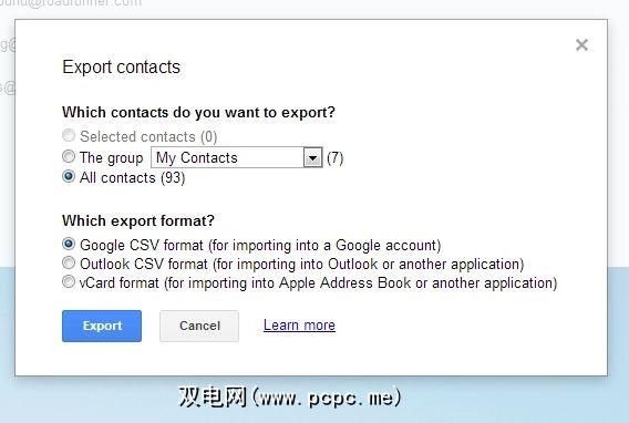 当您单击Gmail帐户的“联系人"部分时,请单击“更多"选项您将看到将地址导出到.CSV文件的功能。最好使用.CSV导出功能,该功能允许您将联系人放入Outlook或任何其他电子邮件提供程序中,因为这样会使您的列表更易于传输。它将为您提供一个文件,您可以将其直接导入到其他电子邮件服务中。确保您不时使用其他电子邮件服务更新联系人,以便始终获得完整的联系人列表。
