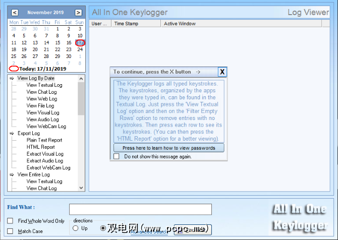 该软件可以向用户隐藏,因此他们不知道自己会陷入陷阱。返回时,您可以通过按 Ctrl + Alt + F9 来显示该程序并查看日志。