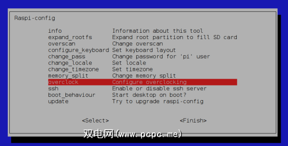 超频很容易。只需启动,切换到配置菜单,然后选择超频选项。可以在本文中找到完整的详细信息:果汁不够?通过超频压缩树莓派。请注意,如果您选择超频Raspberry Pi,则后果自负。您还应该考虑使用风扇或在SoC上附加散热器。