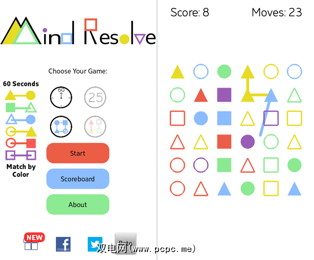 “心灵解决"是Play商店的新功能,因此目前有两种游戏模式(60秒或25种动作)和两种游戏类型(颜色匹配或形状匹配),可以混合和匹配总共4种不同的游戏。游戏的目的是通过颜色或形状匹配尽可能多的对象。通过拖动一条线可以完成匹配,该线可以向上,向下,向右/向左或对角线移动,并且该线没有最大长度。