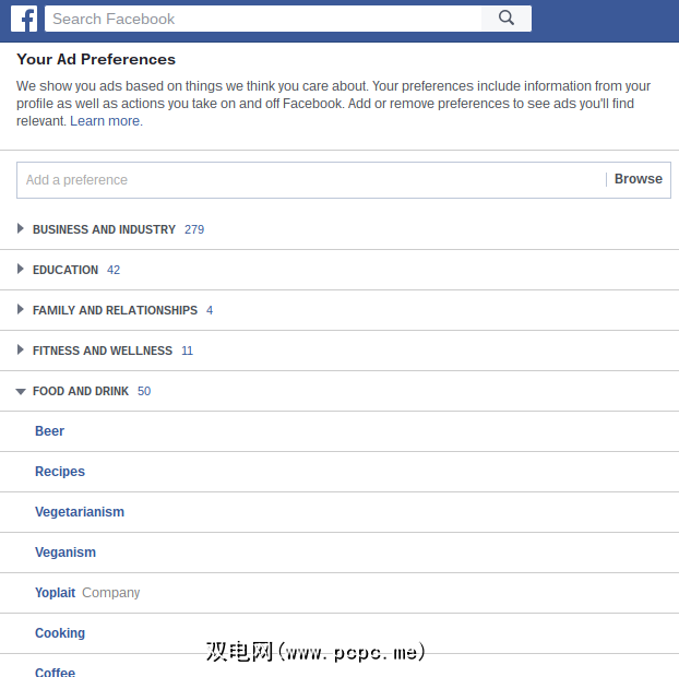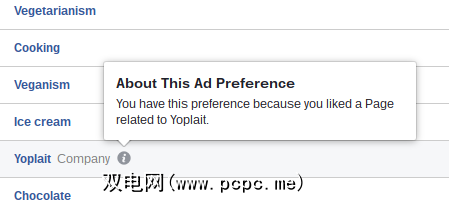 只说您喜欢一个页面,然后该页面就会显示在您的广告偏好设置中。稍后,当您不喜欢该页面时,广告偏好设置将保持不变,直到您对其进行更改。实际上,即使您以前从未喜欢过该页面,有时也会在您的广告偏好设置中显示一些非常具体的内容。它说:“您之所以喜欢此页面,是因为您喜欢与...相关的页面。"