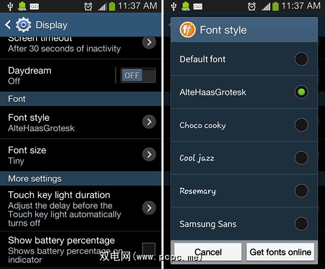 三星有一个在线商店,您可以在其中购买新字体以供使用。要访问商店,请在字体更改屏幕上点击在线获取字体。每种字体的价格在0.99美元到3.99美元之间。
