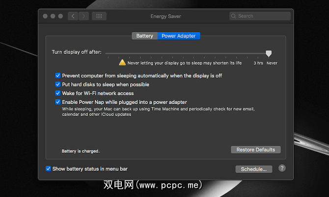 系统偏好设置中的节能器。在其中,您可以找到许多设置来个性化设置Mac电池供电和插入电源时的睡眠时间。您可以设置至少一分钟的时间,甚至将滑块向上推至从不如果要完全禁用自动行为。