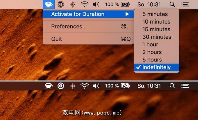 KeepingYouAwake是一款简单易用的应用,可立即让您从菜单栏中更改Mac的待机时间。您可以从一系列持续时间预设中进行选择,包括不确定模式。而且您可以在启动时启动该应用。