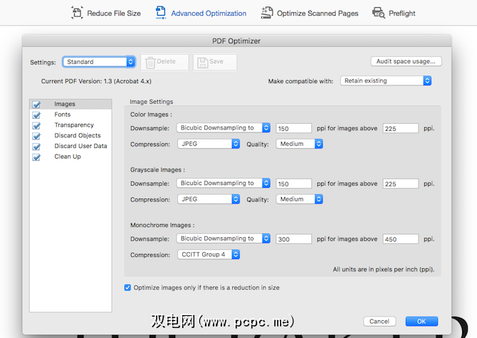 如果您的计算机上安装了Adobe Acrobat,则应用程序中有一个名为“ PDF Optimizer"的工具。这是缩小PDF文档的最佳和最简便的方法之一。