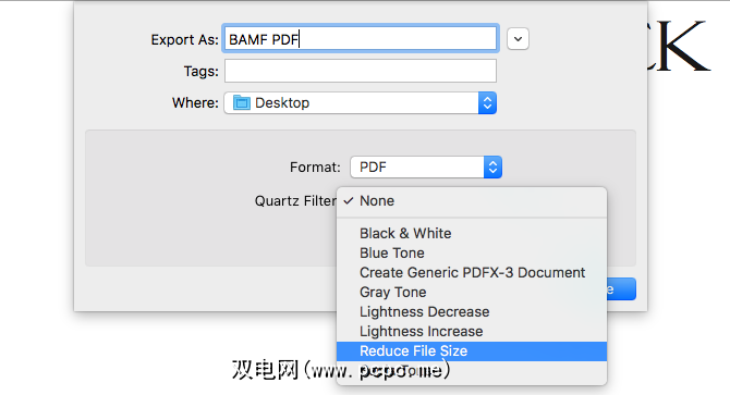 首先,在预览中打开PDF。通常您只需双击该文件,但是如果您安装了PDF阅读器(例如Adobe Reader),则需要右键单击>“打开方式">“预览" )。然后单击文件>导出,然后在Quartz Filter下拉框中选择减小文件大小。