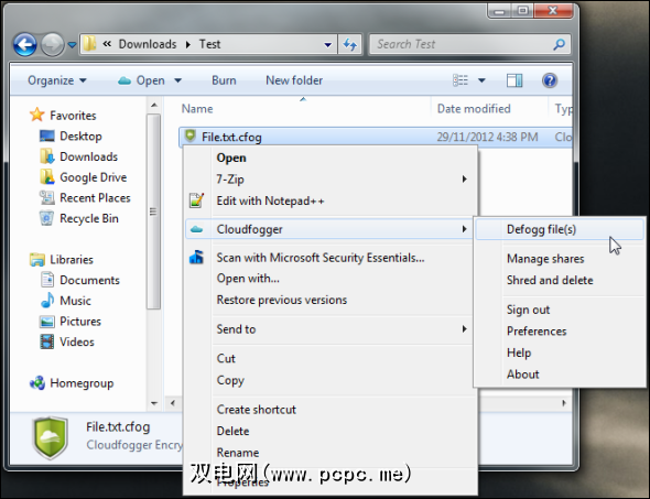 您还可以使用Cloudfogger子菜单轻松加密单个文件。例如,您可以先加密敏感文件,然后再将其放在USB记忆棒上。如果您丢失了USB驱动器,则无需担心-找到该驱动器的任何人都无法查看您的敏感数据。对一个或多个文件进行模糊处理,然后右键单击该文件即可看到“ defogg" 的选项。