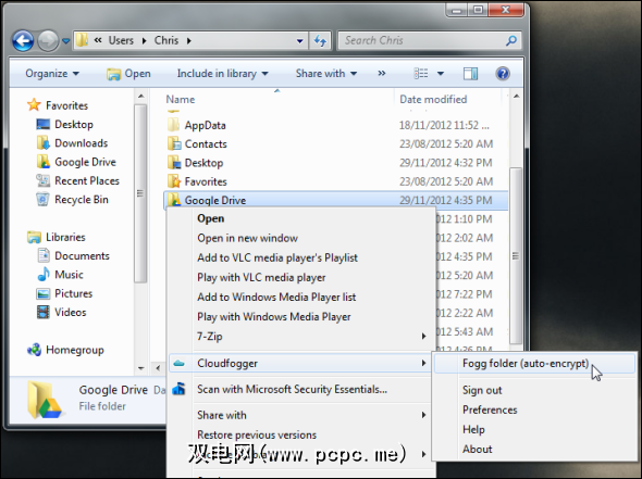 使用Cloudfogger加密在线存储在Dropbox,Google等云存储服务中的文件和文件夹在“驱动器"和“ SkyDrive"目录中,在Windows资源管理器中右键单击它,然后使用Cloudfogger上下文菜单将其定义为“ Cloudfogger Autofogg文件夹"。存储在Dropbox目录中的文件将存储在磁盘上加密形式,只有加密的副本将被上传。