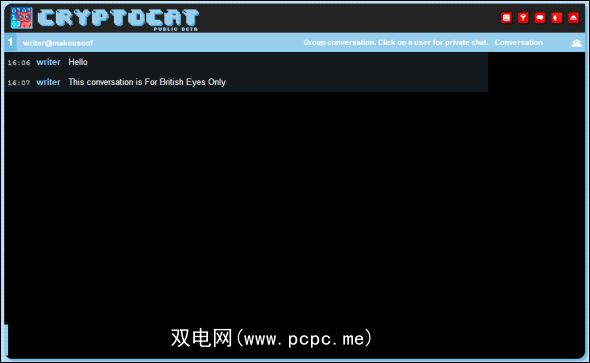 其他人加入您的对话后,您可以与他们进行加密的聊天会话。邮件在您的计算机上进行加密,以加密形式在Internet上传输,并在收件人的计算机上解密。这样可以防止窃听-甚至Cryptocat的服务器也无法查看消息。