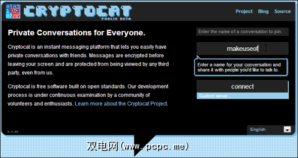 在安装Cryptocat扩展程序后,开始聊天即可。您只需输入两条信息-对话室的名称和您的昵称。与您要交谈的其他人共享对话的名称,他们可以轻松加入。