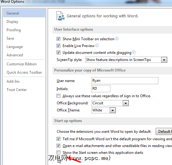 第一个是禁用起始页。克里斯蒂安(Christian)在有关摆脱Word烦恼的文章中提到利用注册表黑客摆脱了首页。您实际上不必这样做。只需单击“文件",然后选择选项“选项",最后单击“常规"选项卡。在页面的大约一半处,您会看到“此应用程序启动时显示开始屏幕"的设置。