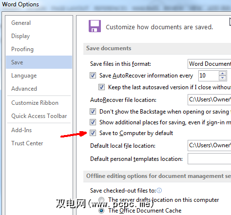 好吧,永远不要害怕,因为有了解决方法为此。转到“文件",“选项",然后单击“保存"菜单项。在此页面上,您会看到“默认情况下保存到计算机"的设置。选中该框。
