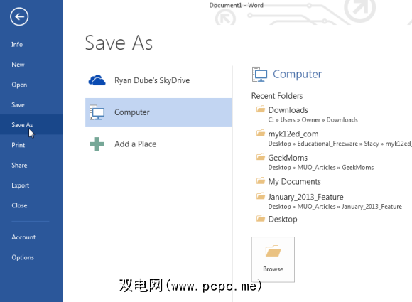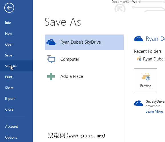 然后有保存选项,可以无条件地推广SkyDrive。每次单击另存为时,它默认为SkyDrive,并且您必须单击计算机来查看本地目录。这是微软努力推动云计算的努力,但是这种面对面的技术推动并不是获得消费者好的一面的方法。