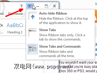 另一种方法是单击带有向上的箭头,然后选择“显示选项卡和命令"。这将设置应用程序,以便像在Office 2010中一样始终访问和显示功能区栏。