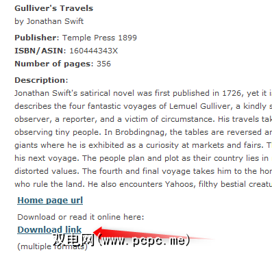 搜索结果并不是世界上最漂亮的东西,但是您可以立即查看电子书可用的语言,格式等。进一步单击将带您进入该电子书的实际站点,您可以在这里下载该电子书。