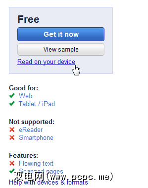 找到所需的书后,请勿单击“ 立即获取"按钮,但按钮下方的“ 在设备上阅读"链接。该界面还将向您显示哪些设备支持此特定的eBook,哪些不支持。