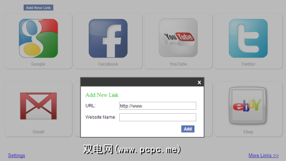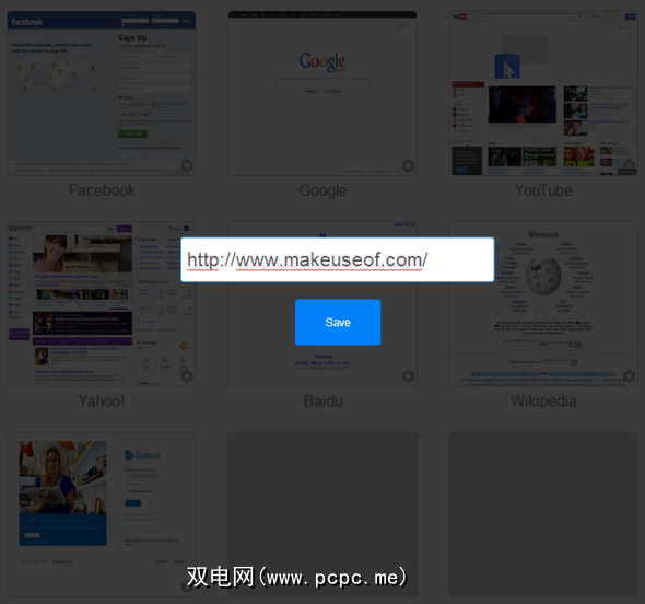 如上所示,您只需单击一个正方形即可用您自己的任何URL替换现有网站。您可以通过点击更多链接按钮为更多站点添加额外的空间,这会将页面总数扩展到15个正方形。