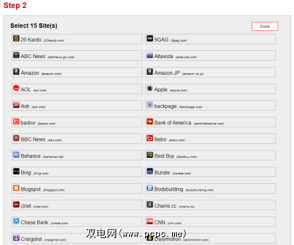 该过程的下一步是选择要包含在页面中的适当数量的网站。 Tilerun提供约100个网站,您可以将它们添加到页面中,但是一个主要缺点是它们不允许您添加自己的自定义URL。从屏幕快照中可以看到,但是它们确实设法包含了网络上一些最受欢迎的网站。