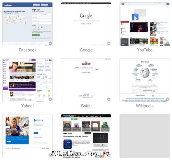 Usertab开始时是快速拨号主页,默认包含七个站点:Facebook,Google,YouTube,Yahoo !、百度,Wikipedia和Windows Live。有两个可用的空白点,但您可以用自己的点替换任何现有的点。