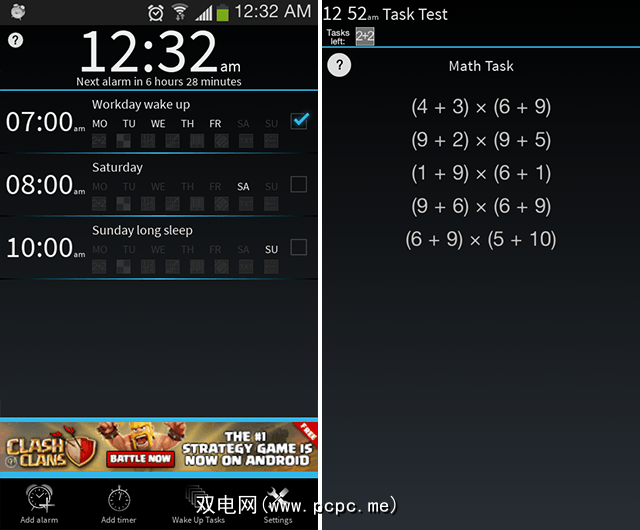 “唤醒任务"非常多样化。这个应用程式可以让您解决数学问题,玩配对游戏,重复随机产生的点击顺序,改写文字行,甚至只是剧烈摇动手机几秒钟。