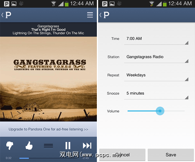 也很简单。只需设置警报选项(时间,重复类型,重响时长,音量)以及您想让Pandora在警报响起时播放的电台即可。完成后,您可以选择取消闹钟,暂停闹钟或继续播放音乐。当您想唤醒并非总是同一首歌的特定类型的音乐时,这是一个很棒的功能。