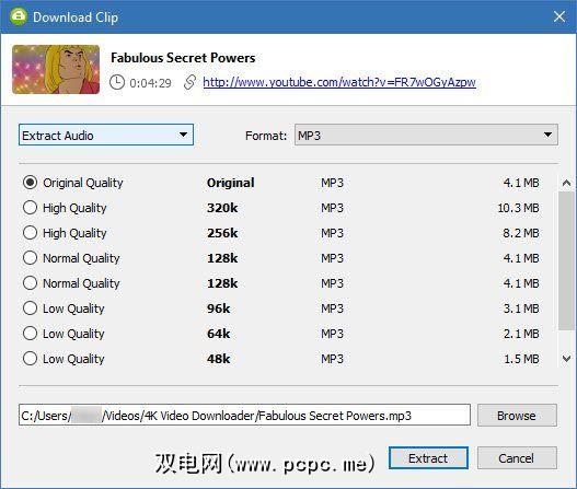 请注意,4K Video Downloader也可以从YouTube视频中提取音频。选择提取音频,而不是下载视频,然后可以从 MP3 , M4A 和 OGG 格式的各种品质。