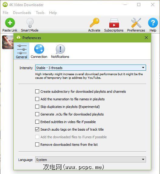 在常规标签上,您可以更改应用程序用于下载视频的线程数。增大此数量可以提高下载速度,但将其设置得太高则可能会导致YouTube暂时禁止下载,因此请务必谨慎。 3 的默认设置对于大多数用户来说都可以。除非您真的知道自己在做什么,否则我们将避免使用此设置。