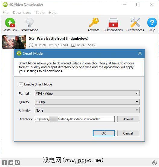 要每次都应用相同的下载设置并保存多余的点击次数,可以设置智能模式。只需在主窗口中单击其图标,然后选择适用于每次下载的选项即可。这样一来,您只需单击一下即可下载,如果您不需要一直更改格式,那就太好了。例如,如果您知道始终需要1080p的Mp4,则可以对其进行设置。