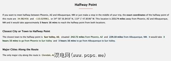 “城市之间的距离"网站为您提供了两个城市之间的距离以及有关该路线的大量信息。此外,他们还提供了中途点的部分。因此,请在主页上输入两个城市,然后进入结果,只需向下滚动至该部分即可。
