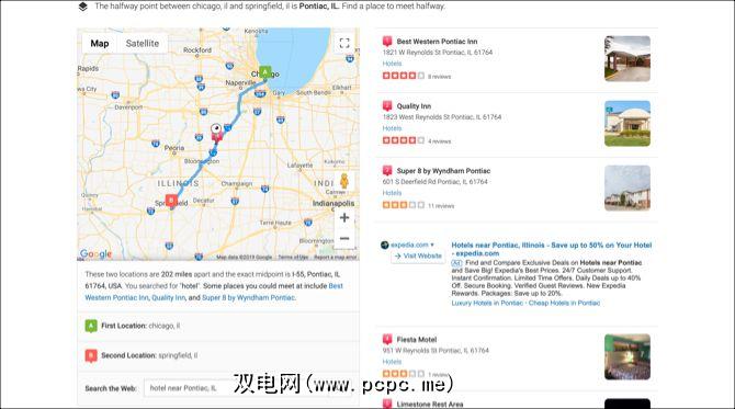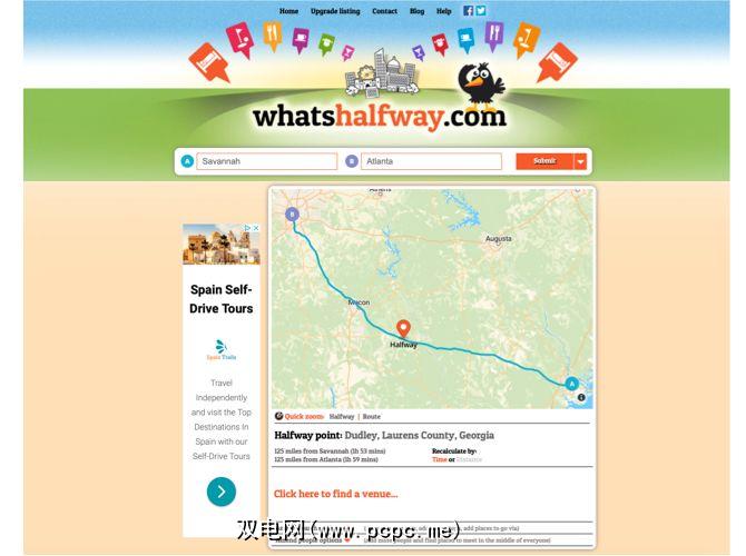MeetWays提供与WhatsHalfway类似的功能,但您可能会喜欢一些附加功能。首先输入您的两个城市或邮政编码,然后弹出感兴趣的地点。在点击 Go!按钮之前,您可以根据需要添加行驶模式,收费公路或高速公路的选项。