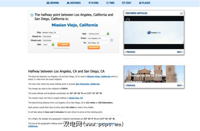 TravelMath是一个可帮助您计划旅行(无论是开车还是飞行)的网站。但是,它们也提供了方便的方法来找到您的中间点。当您登陆网站时,请使用下拉框并选择 Halfway Point ,然后输入两个城市并点击 Go 。