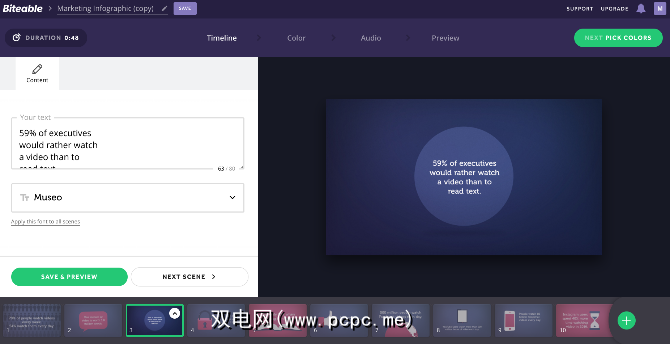 首先,请从网站的视频模板库中进行选择。您可以更改视频中任何场景的文本,添加或删除背景音乐,以及添加或删除场景。 Biteable非常易于使用,不需要您事先进行视频编辑。