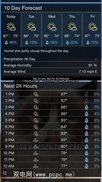 除了当前的状况外,您还可以查看每小时和五天的天气预报,接收天气警报,查看多个天气位置以及更改温度单位,时间设置格式和背景类型。
