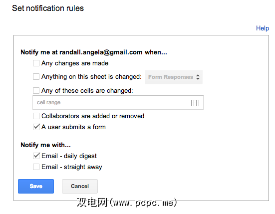 设置起来有些麻烦;有点不直观。但是,一旦完成几次,您将永远不会忘记如何做。为此,通过单击工具栏中的“选择响应方法",将响应方法更改为电子表格。然后单击“查看响应"以查看电子表格。选择工具>通知规则,然后选择是要立即通知还是每天进行批处理通知。