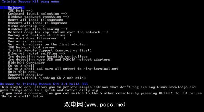 Trinity Rescue Kit专门针对常见的Windows和Linux问题而设计。创作者Tom Kerremans编写了Live CD,以使用一系列病毒和恶意软件扫描程序,密码恢复工具,分区恢复工具以及驱动器克隆实用程序来振兴故障系统。