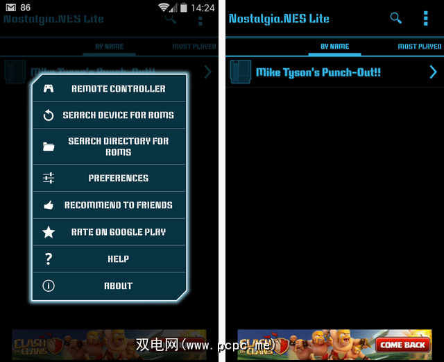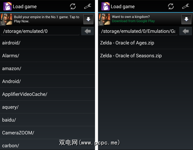 打开Nostalgia.NES,它将尝试在设备上搜索ROM。如果无法自动找到它们,则只需手动将其显示在NES目录中即可,就像以前的目录一样。单击左上角的三个点,然后选择“搜索ROM的目录"。浏览到您的Emulation文件夹,您将看到一个漂亮整洁的菜单。