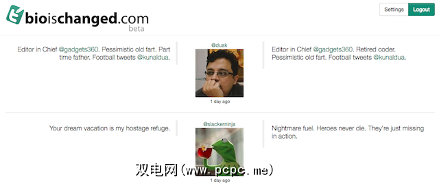 这就是您需要更改生物的地方。授权它使用您的Twitter帐户,您将看到他们关注的人的时间表,基于他们上次更新自己的个人资料或个人资料的时间。该站点将为您提供前后快照,因此您知道发生了什么变化。在应用程序的设置中,您也可以选择通过即时,每日或每周的电子邮件来更新这些更改。