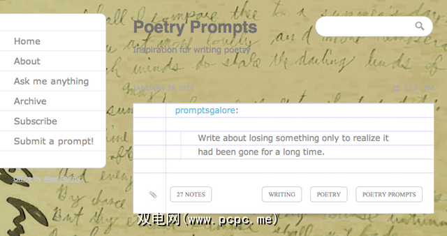 可以在社交媒体上轻松找到灵感点和每日提示。您每天都会不知疲倦地发布写作提示的一个Twitter帐户是Daily Prompt,并且已经有相当长的一段时间了。如果您刚开始关注,则有1,400多个提示需要经过。在Tumblr上,诗歌提示是存档于2012年2月的提示的源文件。
