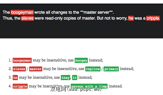 Alex是一个可爱的小工具,它可以捕获无意的冒犯性语言,提出替代建议,最重要的是,解释原因并帮助您更好地使用敏感词。另外,该开源应用程序可以作为流行写作应用程序(例如Github的Atom或聊天应用程序)(例如Slack)的附件来提供。