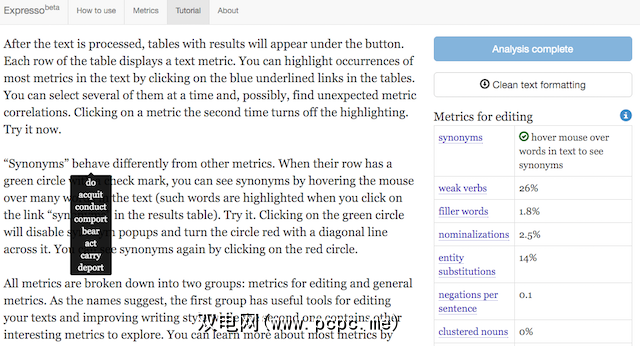 它类似于海明威应用程序(海明威应用程序),这是基于作家的最佳基于浏览器的工具之一。它将指出太复杂或太短的句子,不必要的单词,被动语态,弱动词等等。这是Expresso指标的完整列表。请记住,这些主要是建议,因此您可以决定要进行哪些编辑以及要忽略哪些编辑。