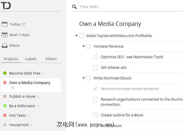 如上所述,我已经尝试了各种待办事项清单应用程序,而在我最终决定生活/生产力计划这一核心阶段的所有应用程序中,有一个是ToDoist。我喜欢ToDoist的地方是它与您的“项目"一起放在左侧。从您在目标规划师应用中定义的每个人生目标中选择一个项目,然后在ToDoist中创建一个项目。接下来,当您计划完成每个项目时,您只需按明确的时间表将项目分解为较小的目标即可。