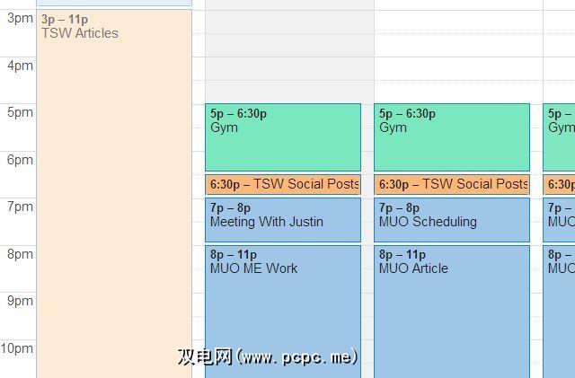 像Google日历这样的功能,在于您可以开始添加要处理的小任务之前为了达到目标,您首先需要将您知道每周必须完成的“自动化"工作插入其中。例如,我知道作为MUO的执行编辑的任务涉及与执行编辑Justin进行每周星期一的聊天。我还需要完成管理发布时间表的工作。然后有MUO文章要写,还有其他可预见的事情,我可以循环插入到日程表中。