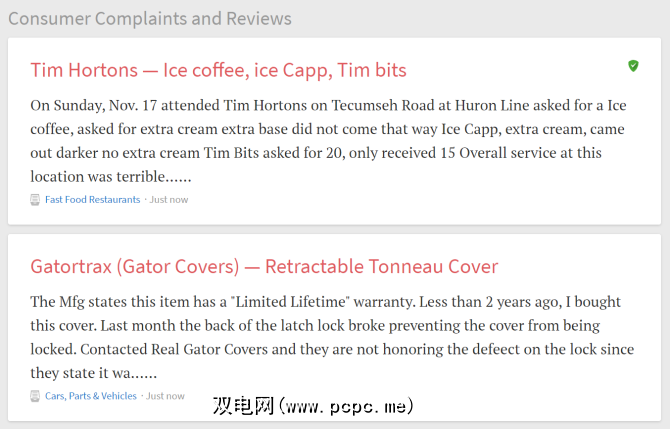 当您搜索不同的评论时,您会注意到您可以给评论“竖起大拇指" "或“竖起大拇指",甚至留下一些评论。如果您要查找特定公司的评论,请执行简单的搜索-烦死的消费者会显示该公司的最新投诉以及联系信息。