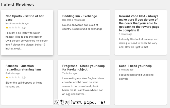 PissedConsumer包括一个业务评论和投诉数据库,涉及各种各样的主题,公司,产品和服务。 “最新评论"页面包含清晰的标题和消费者投诉摘要,以及正面反馈。