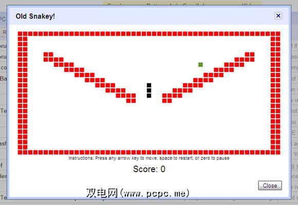 Old Snakey是Gmail实验室最古老的成员之一。 Gmail相当于经典的Snake游戏。从设置–实验室–旧Snakey 激活它。您还必须启用Gmail的键盘快捷键(设置-键盘快捷键)。然后只需点击“&"即可开始游戏。适用经典规则。